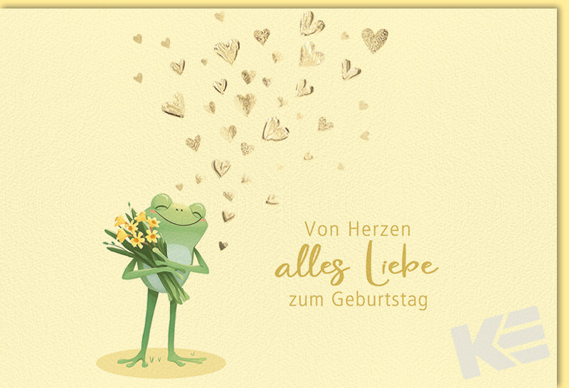 Verkauf nur als Dreher-Konzept, Geburtstag, Beautiful Green, strukturierter weißer Karton, Druckkarte, mit Prägung, der Natur zuliebe unverpackt, QUER, Frosch mit Blumen, Herzen
