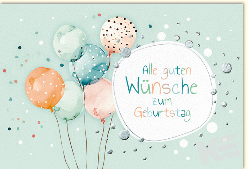 Verkauf nur als Dreher-Konzept, Geburtstag, Beautiful Green, strukturierter weißer Karton, Druckkarte,QUER, mit Prägung, der Natur zuliebe unverpackt, Bunte Ballons