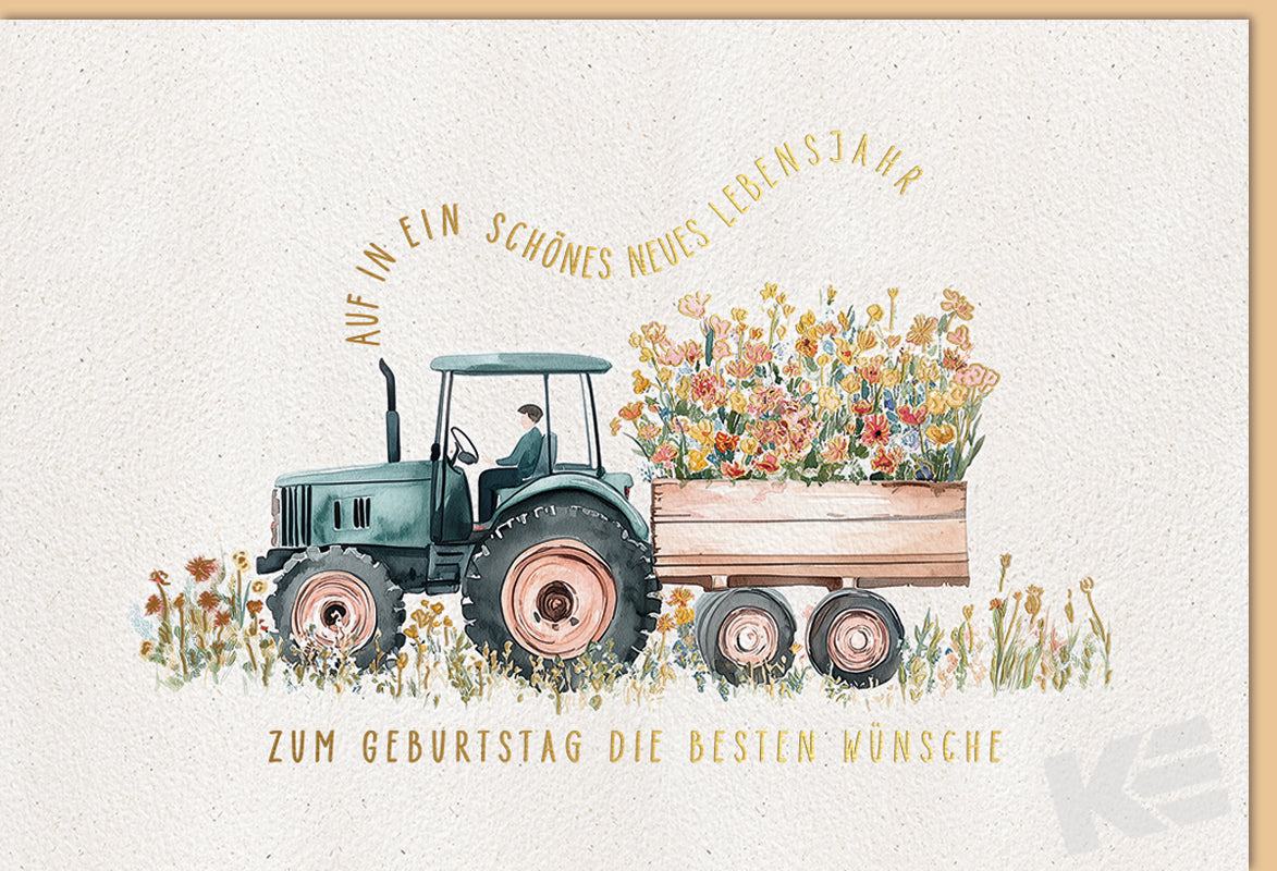 Verkauf nur als Dreher-Konzept, Geburtstag, Beautiful Green, strukturierter weißer Karton, Druckkarte, QUER, mit Prägung, der Natur zuliebe unverpackt, Traktor, Blumen