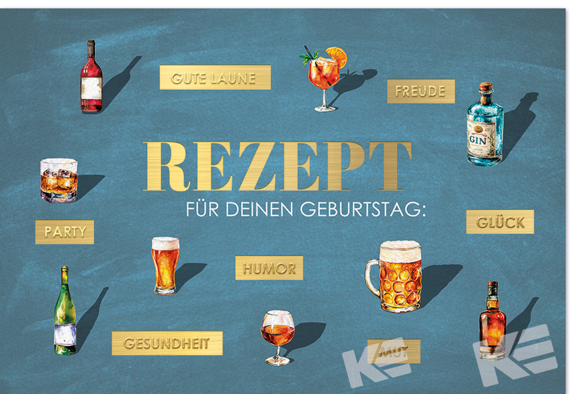 Verkauf nur als Dreher-Konzept, Geburtstag, Beautiful Green, strukturierter weißer Karton, Druckkarte, QUER, mit Prägung, der Natur zuliebe unverpackt, kleine Bilder, Alkohol