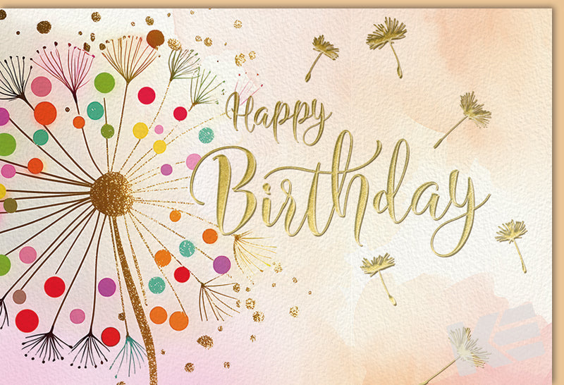 Verkauf nur als Dreher-Konzept, Geburtstag, Beautiful Green, strukturierter weißer Karton, Druckkarte, QUER, mit Prägung, der Natur zuliebe unverpackt, Bunte Pusteblume
