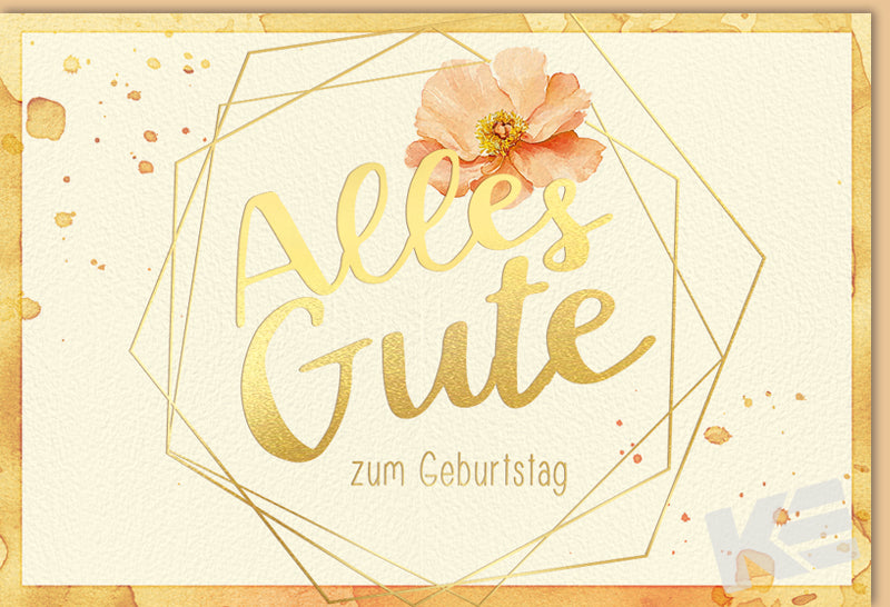 Verkauf nur als Dreher-Konzept, Geburtstag, Beautiful Green, strukturierter weißer Karton, Druckkarte, QUER, mit Prägung, der Natur zuliebe unverpackt, Bunte Blume, Goldener Rahmen