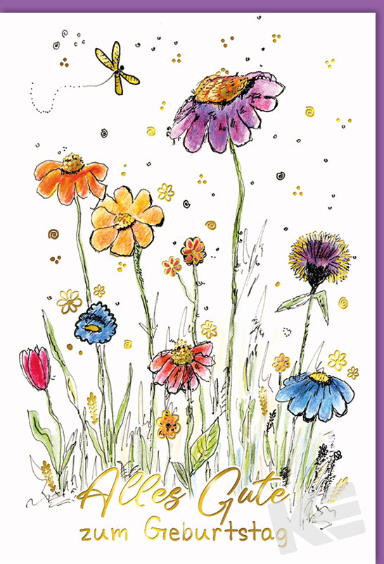 Geburtstag, Druckkarte, weißer Karton, gezeichnetes Motiv, Bunte Blumen