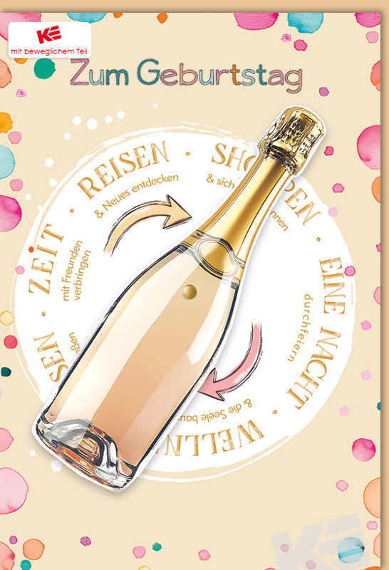 Druckkarte, weißer Karton, Karte mit Accessoires, Drehscheibe, Sektflasche