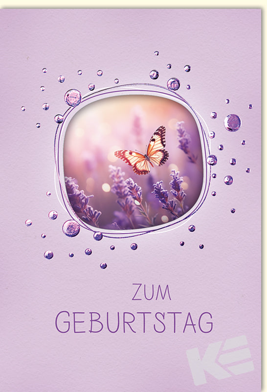 Druckkarte, weißer Karton, Prägung, lila Blumen, Schmetterling