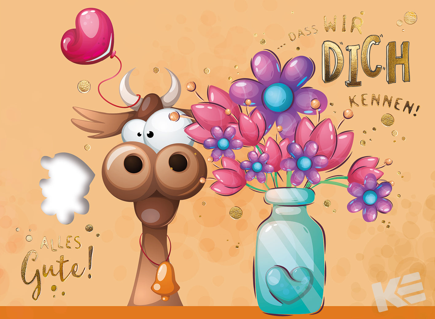Weißer Karton, Druckkarte, mit Innendruck, Prägung innen und außen, Ausstanzung, lustiges Tier, Blumenstauß, Spruch