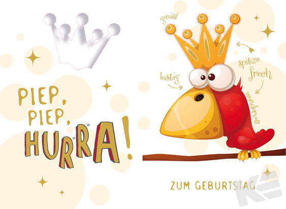 Weißer Karton, Druckkarte, mit Innendruck, Prägung innen und außen, Ausstanzung,Sessel, Krone, Spruch