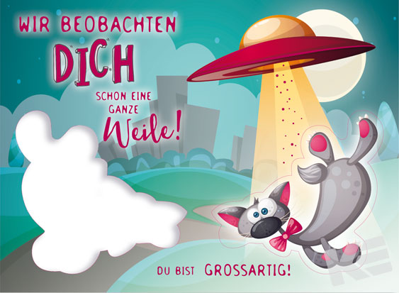Weißer Karton, Druckkarte, mit Innendruck, Prägung innen und außen, Ausstanzung,Spruch, Achtung, Wolke, Ufo, lustige Katze