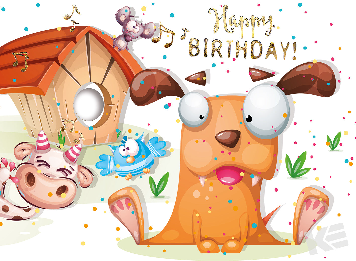 Weißer Karton, Druckkarte, mit Innendruck, Prägung innen und außen, Ausstanzung,Spruch, Haus, Party, lustige Hunde, Klee