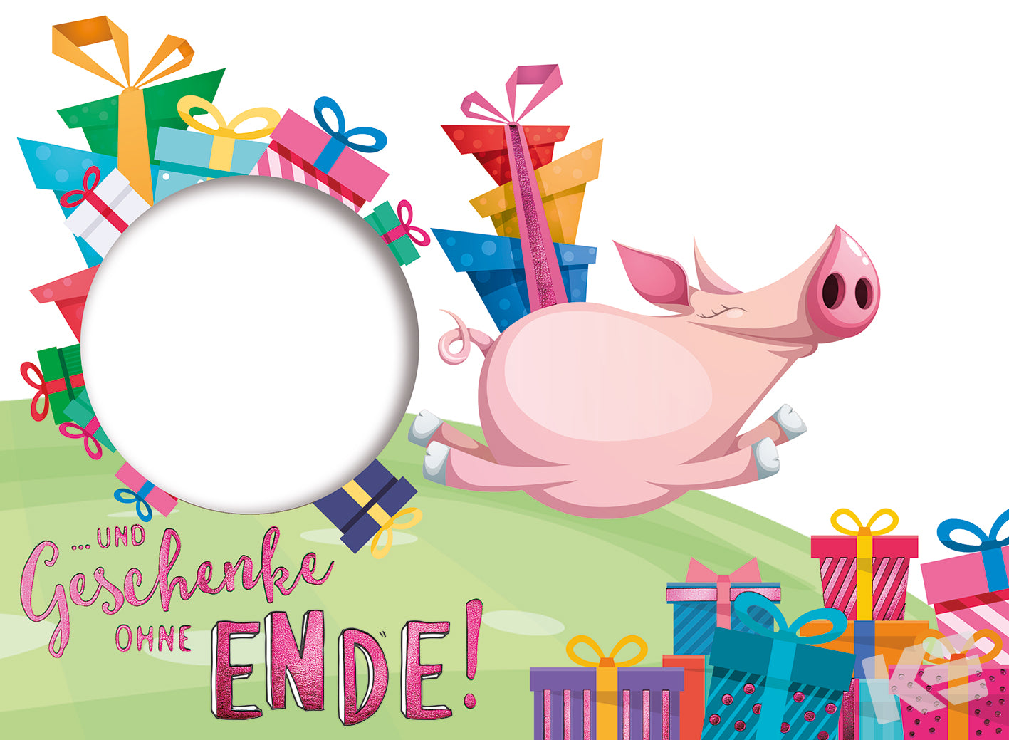 Weißer Karton, Druckkarte, mit Innendruck, Prägung innen und außen, Ausstanzung,Spruch, lustiges Schwein, Kreis, bunte Päckchen