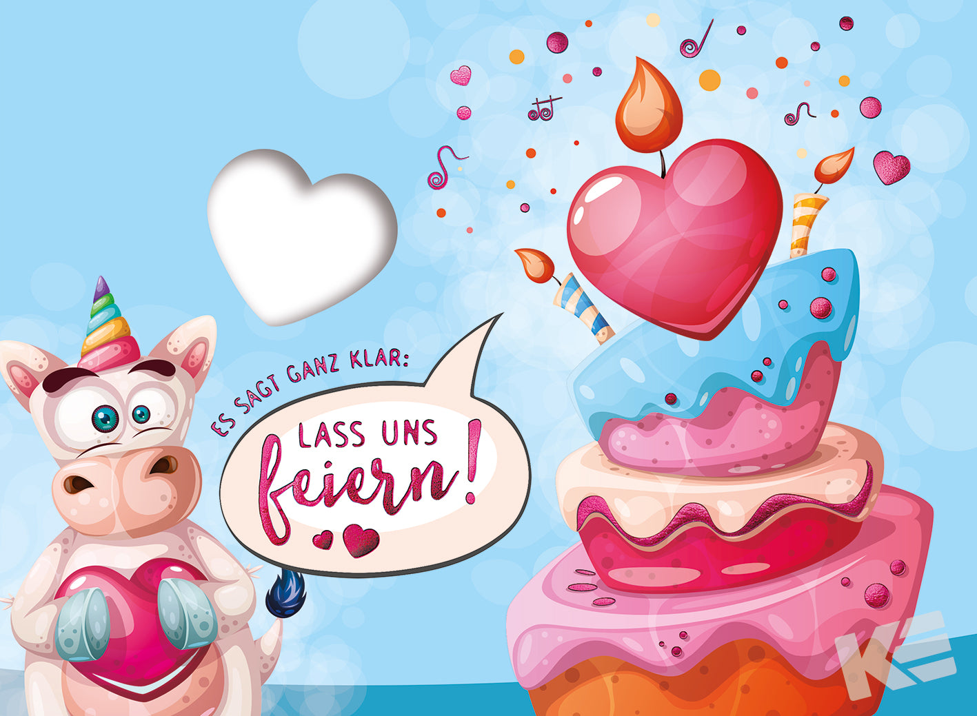Weißer Karton, Druckkarte, mit Innendruck, Prägung innen und außen, Ausstanzung,Spruch, Herz, Kopfhörer, lustige Kuh, Torte