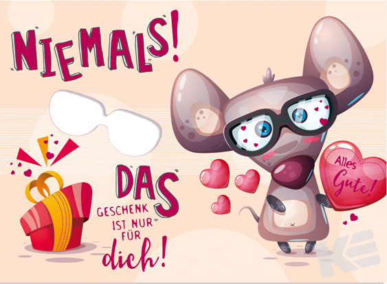 Weißer Karton, Druckkarte, mit Innendruck, Prägung innen und außen, Ausstanzung,Spruch, lustige Maus, Päckchen, Herz