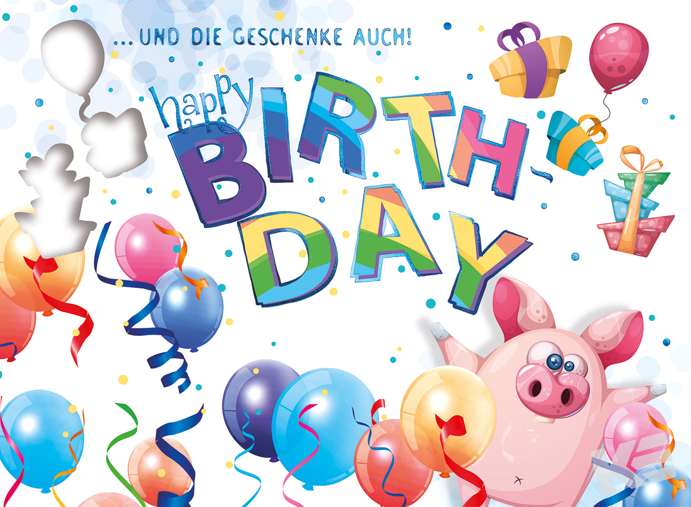 Weißer Karton, Druckkarte, mit Innendruck, Prägung innen und außen, Ausstanzung,Spruch, lustiges Schwein, Luftballon, Pakete, Happy Birthday