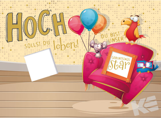 Weißer Karton, Druckkarte, mit Innendruck, Prägung innen und außen, Ausstanzung,Spruch, lustiger Vogel, Sofa, Maus, Luftballons