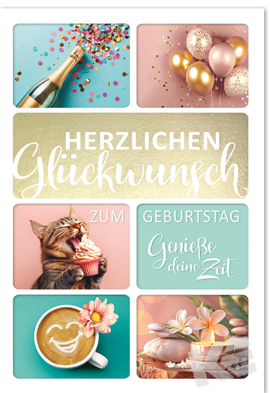 Geburtstag, Druckkarte, kleine Bilder, Katze,Sekt, Kaffee, mit Heißfolienprägung