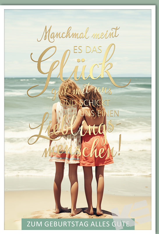 Geburtstag, Druckkarte, weißer Karton, Mädchen, Strand, Meer, mit Heißfolienprägung