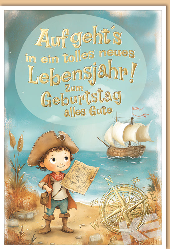 Druckkarte, weißer Karton, Motiv gezeichnet, Pirat, Schiff, Heißfolienprägung