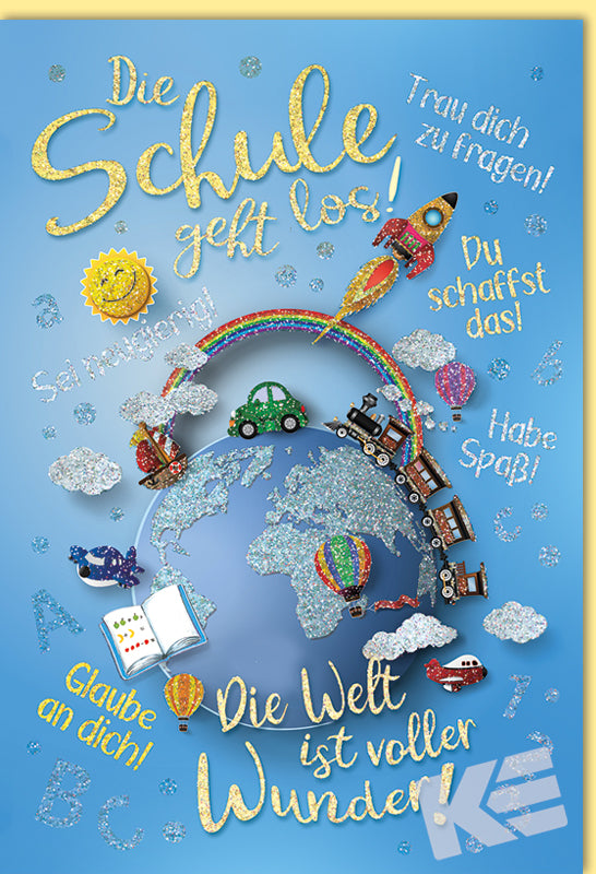 Schulanfang, Druckkarte, weißer Karton, Weltkugel, Wolken, Regenbogen, Karte mit Glimmereffekt