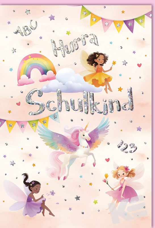 Schulanfang, weißer Karton, Druckkarte, Wolken, Regenbogen, Einhörner, Feen, Karte graviert