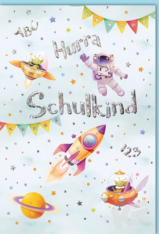 Schulanfang, Druckkarte, weißer Karton, bunte Motive, Gerlanden, Karte graviert