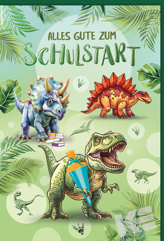 Schulanfang, Druckkarte, weißer Karton, Dinosaurier, Karte graviert