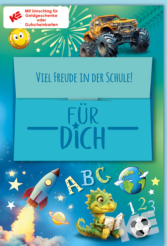 Schulanfang, Druckkarte, weißer Karton, Geldscheinkarte, mit Stanzung für Großen Umschlag,