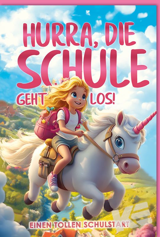 Schulanfang, Druckkarte, weißer Karton, Mädchen auf Einhorn,