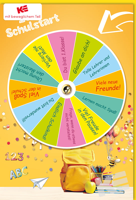 Schulanfang, Druckkarte, weißer Karton, Rucksack, Konfetti, Zahlen, Buchstaben, mit Accessoires, Drehscheibe mit verschiedenen Sprüchen