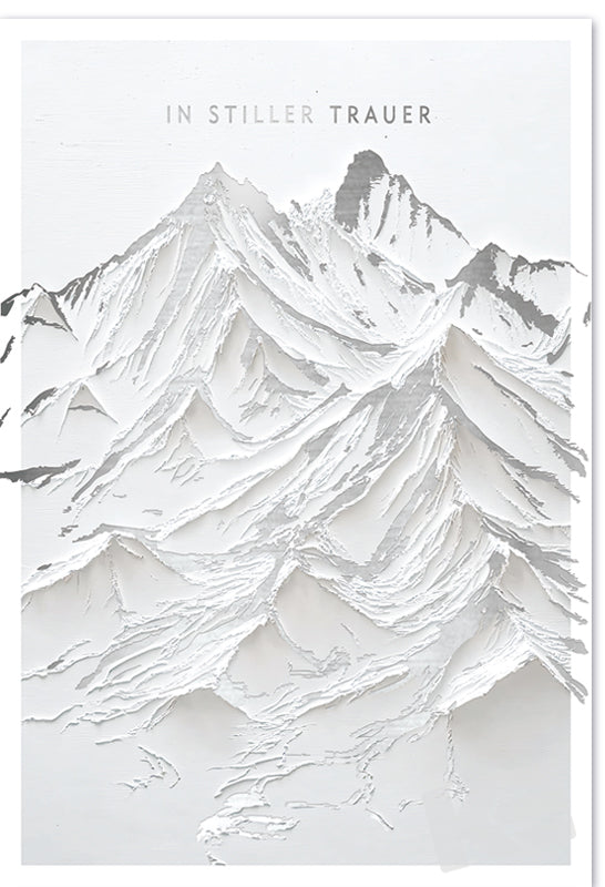 Trauer, Druckkarte, weißer Karton, Berge, mit Folienprägung