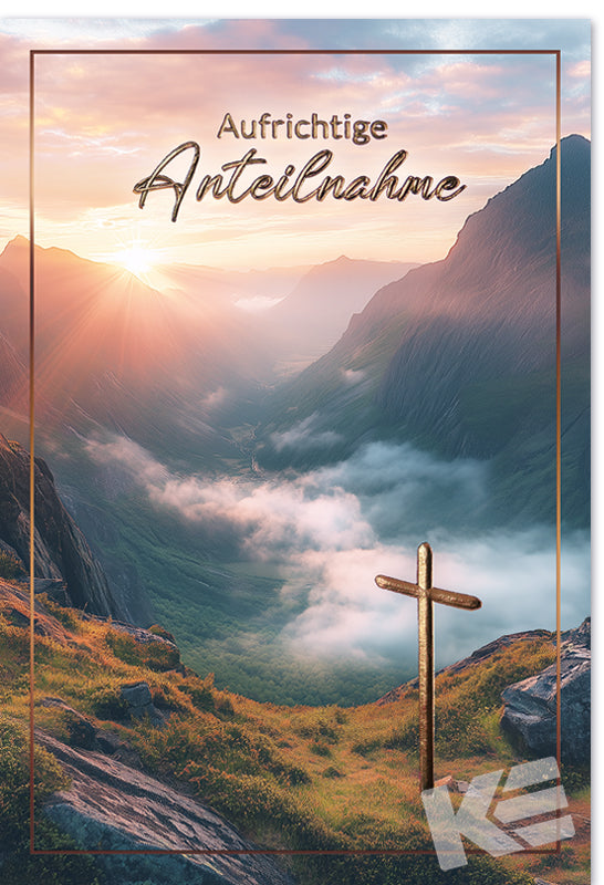 Trauer, Druckkarte, weißer Karton, Aufrichtige Anteilnahme, Berge, Nebel, Kreuz, mit Heißfolienprägung
