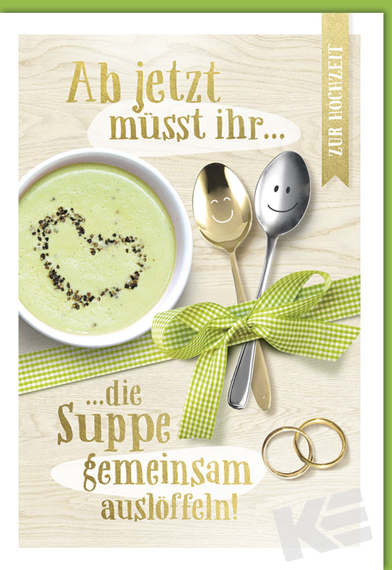 Hochzeit, weißer Karton, Druckmotiv,Suppe, Löffel, Ringe